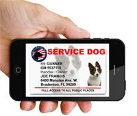 A bold red βSERVICE DOGβ heading and a patriotic crest with a dog silhouette reinforce the cardβs official status.